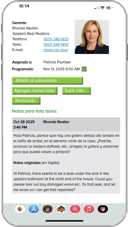 Notice the two links at the top–clicking those will translate the page to Spanish or French. It even translates all of the realtor’s notes in the Notes History. The vendor can respond in Spanish or French, and those notes get translated back to English for the realtor.